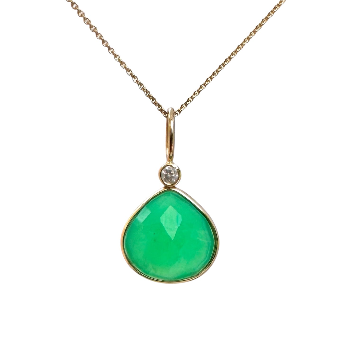 Der Chrysopras Anhänger in 18kt Gold setzt mit seinem lebendigen Grün einen eleganten Farbakzent für Liebhaber edler Schmuckstücke. Der Tropfen aus Chrysopras wird durch einen kleinen Brillantschliff-Diamanten dezent veredelt, der dem Anhänger eine feine, luxuriöse Note verleiht. Dieses Schmuckstück verbindet natürliche Schönheit mit hochwertiger Handwerkskunst und eignet sich ideal, um jedem Outfit eine besondere Ausstrahlung zu verleihen.
