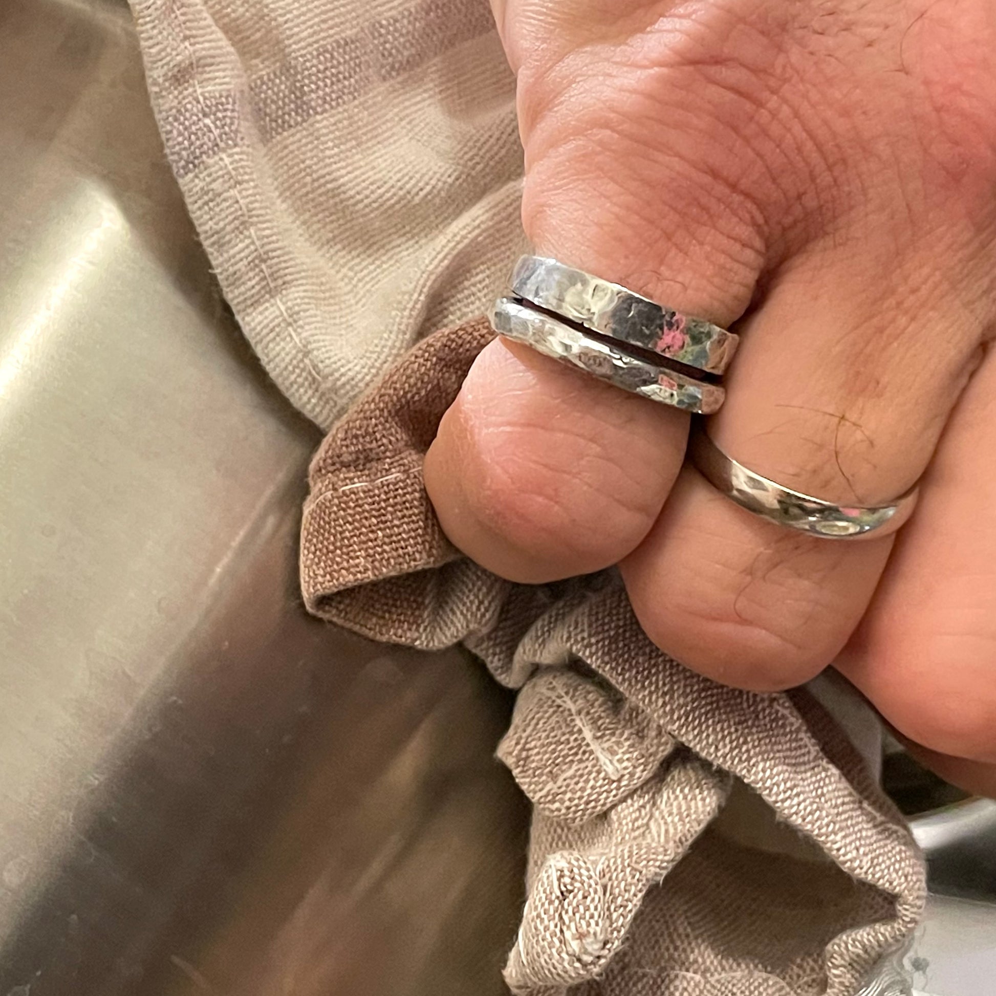 Unser Eternity Ring aus gehämmertem Sterlingsilber ist Teil unserer Kollektion für Männer. Die gehämmerte Oberfläche verleiht dem Ring eine einzigartige Textur und macht ihn zu einem zeitlosen Accessoire.