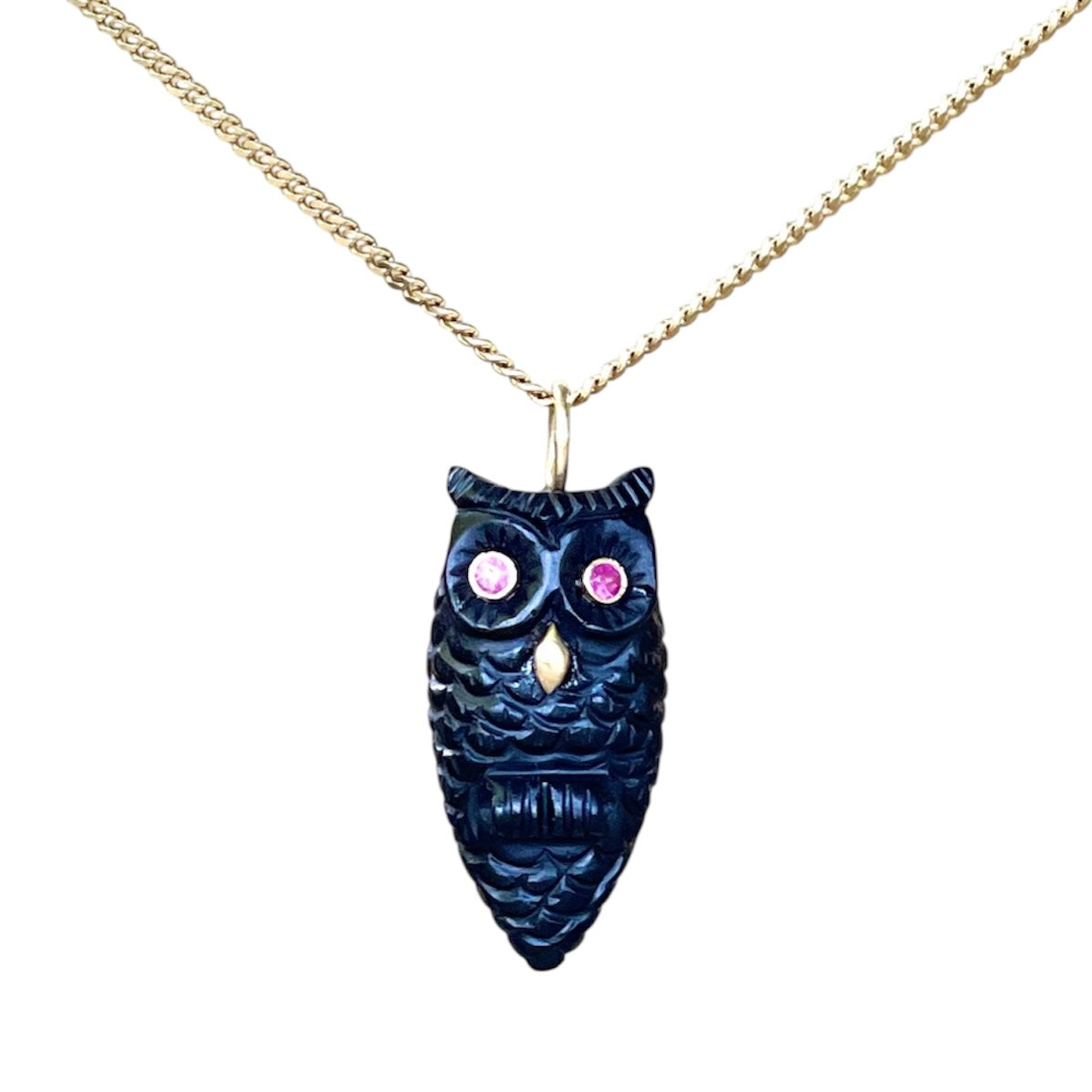 Dieser Eule Onyx Anhänger aus 18Kt Gold vereint den Schutzstein Onyx und das Krafttier Eule, welches für Weisheit steht, zu einem wertvollen Schmuckstück. Die Augen aus Rubinen verleihen dem Anhänger zusätzliche Kraft und Ausstrahlung.