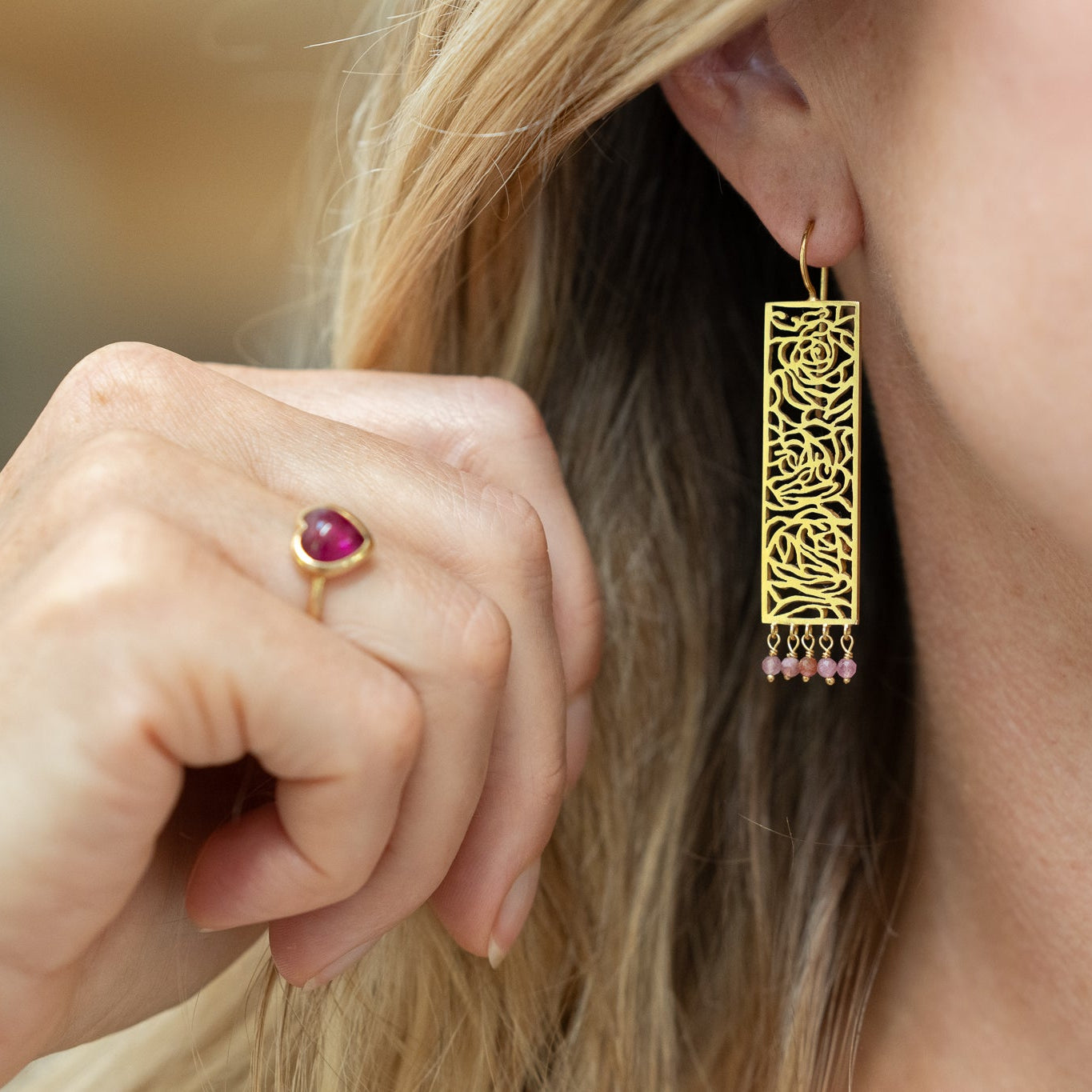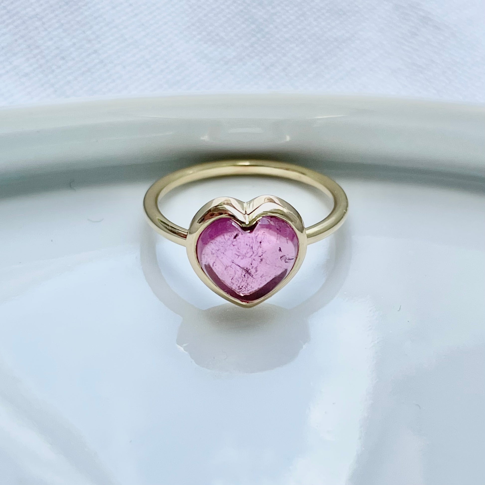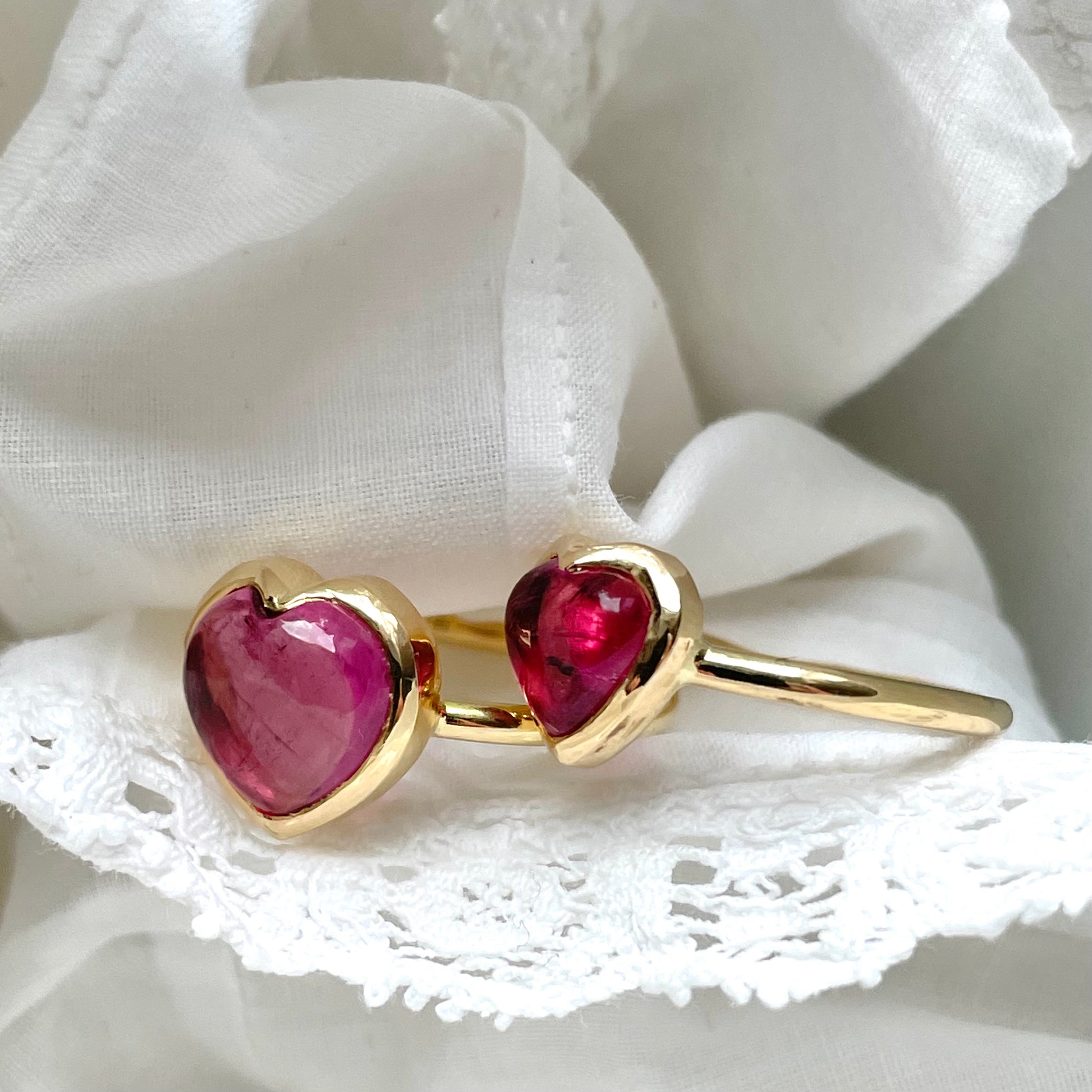 Dieser Goldring mit einem Rubellit-Turmalin im herzförmigen Cabochon-Schliff ist in edles 18kt Gold gefasst. Das Herzsymbol verkörpert Liebe, Mitgefühl, Leben und tiefe Verbundenheit.