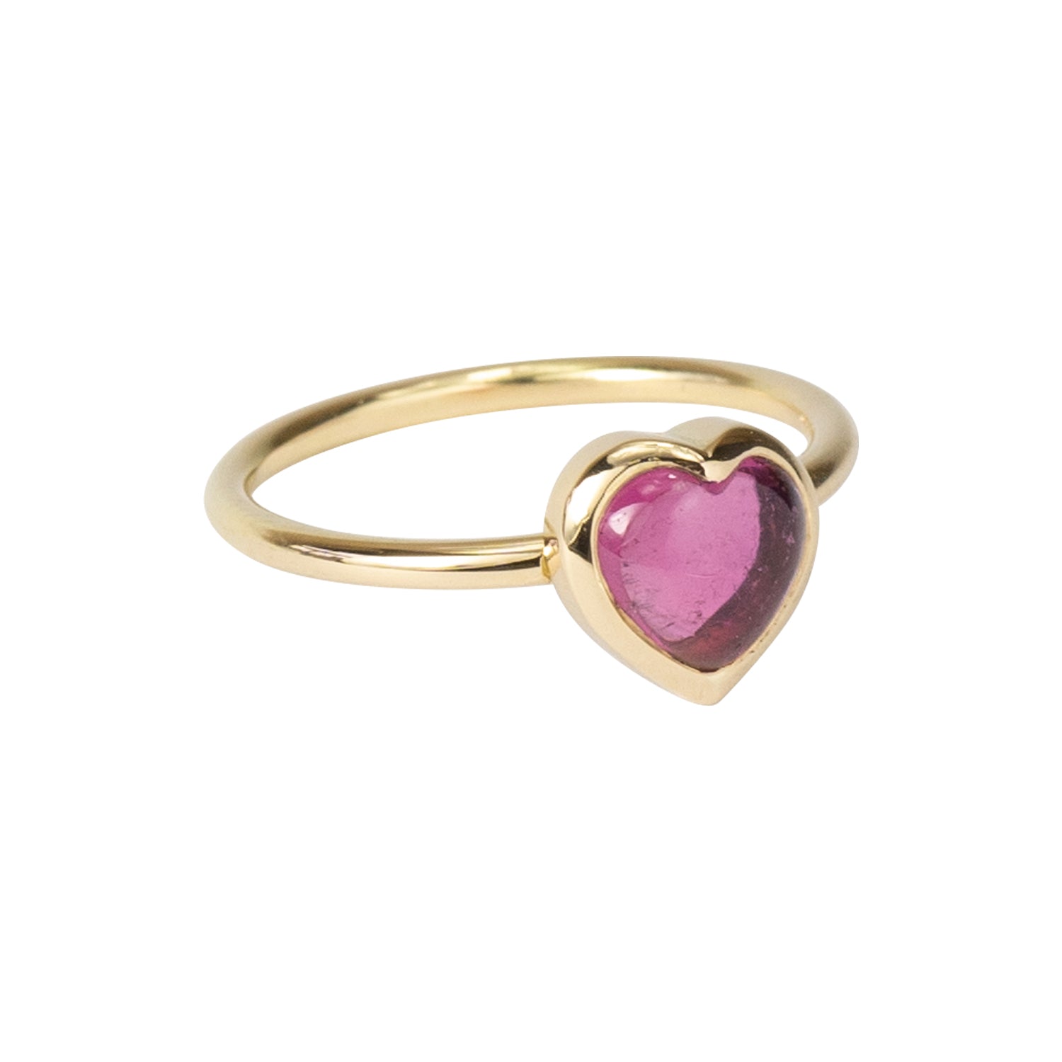 Dieser Goldring mit einem Rubellit-Turmalin im herzförmigen Cabochon-Schliff ist in edles 18kt Gold gefasst. Das Herzsymbol verkörpert Liebe, Mitgefühl, Leben und tiefe Verbundenheit.