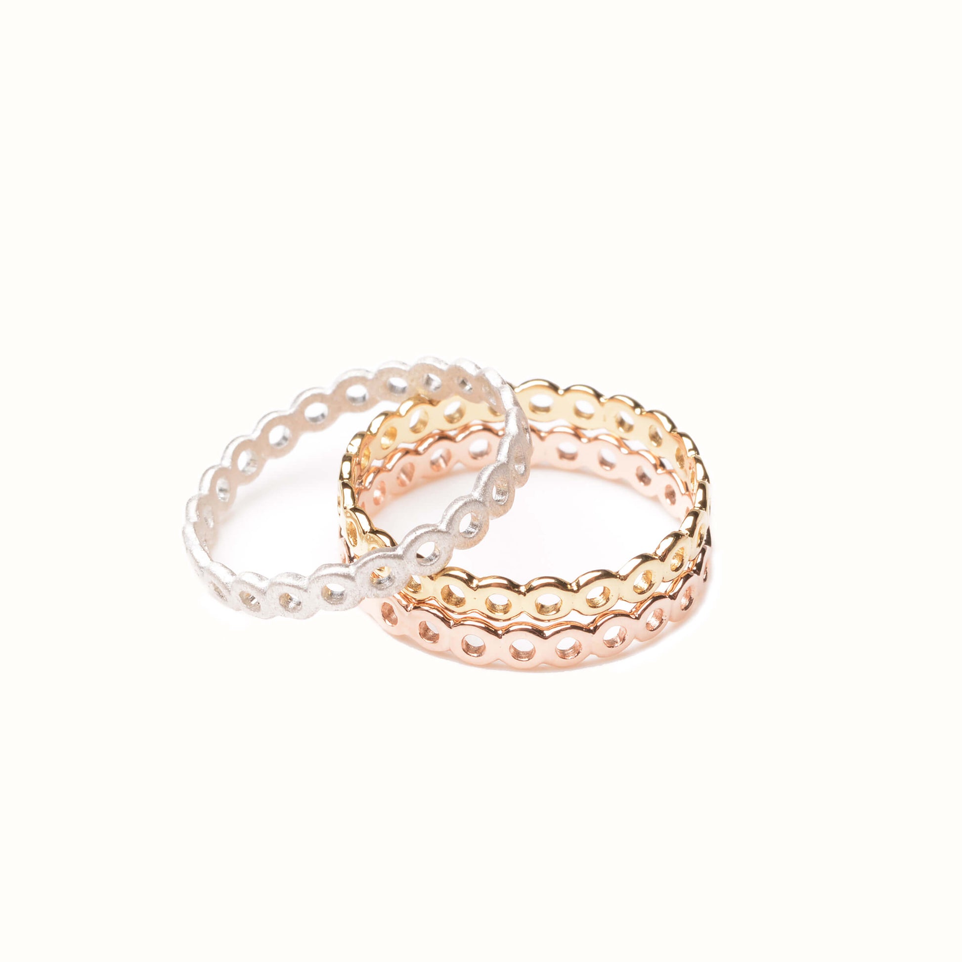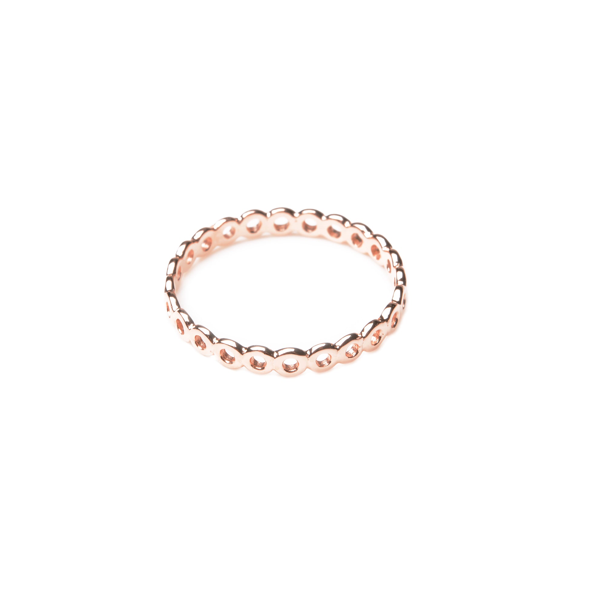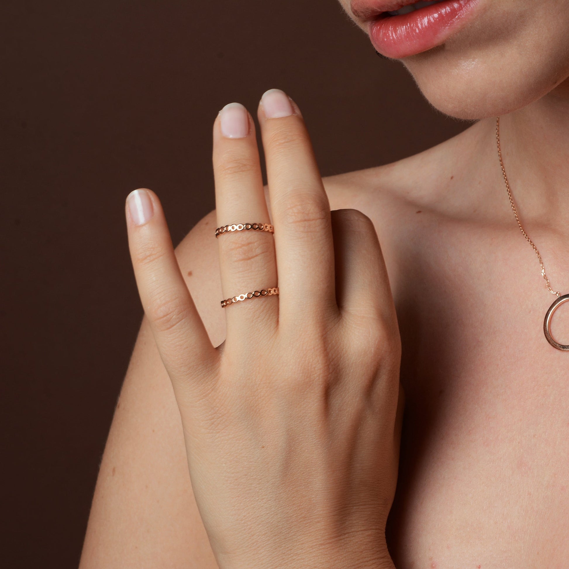 Entdecken Sie den filigranen Kreis Ring. Die zarten, aneinander gereihten Kreise symbolisieren Einheit und Harmonie und verleihen Ihrem Look eine minimalistische Note. Perfekt für jeden Anlass.