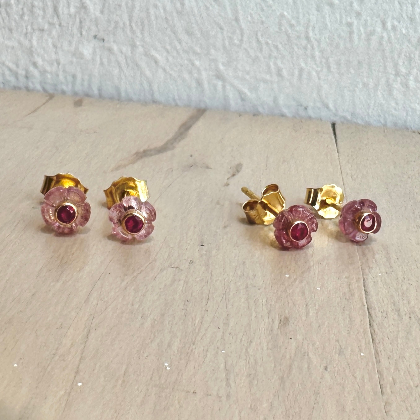 Die handgeschliffenen rosa Turmalinblumen mit einem kleinen Saphir in der Mitte sind einzigartig und in verschiedenen Größen erhältlich. Hergestellt aus 18Kt Gold, sind diese Ohrstecker Unikate mit individuellem Erscheinungsbild. Fragen Sie gerne nach den verfügbaren Stücken und lassen Sie sich ein Bild zukommen. Perfekt für einen eleganten Look.