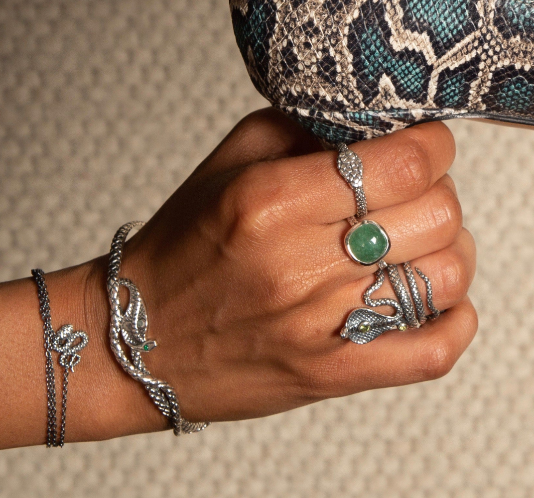 Der Python Ring gehört zur Schlangen Kollektion von SABHA. Die Schlange stellt in allen Kulturen die grundlegende Lebens- und Schöpferkraft dar. Sie symbolisiert die heilende Kraft der Natur. Die Kundalini-Schlange, der Hermesstab, der Ouroboros und viele weitere sind in unterschiedlichsten Kulturen prägende Symbole.