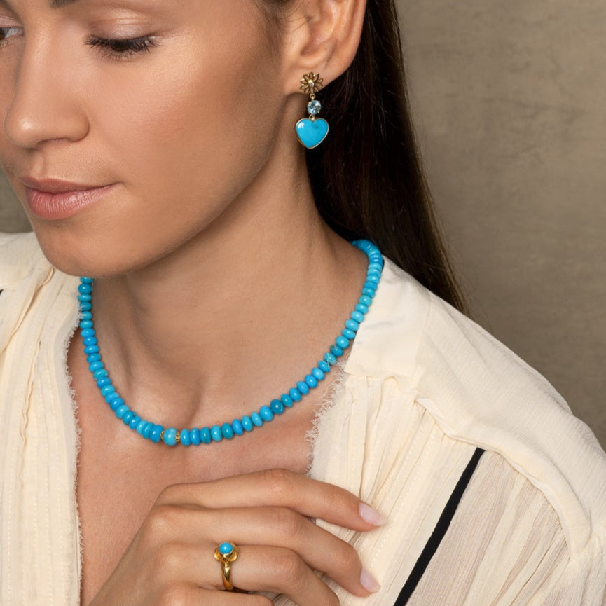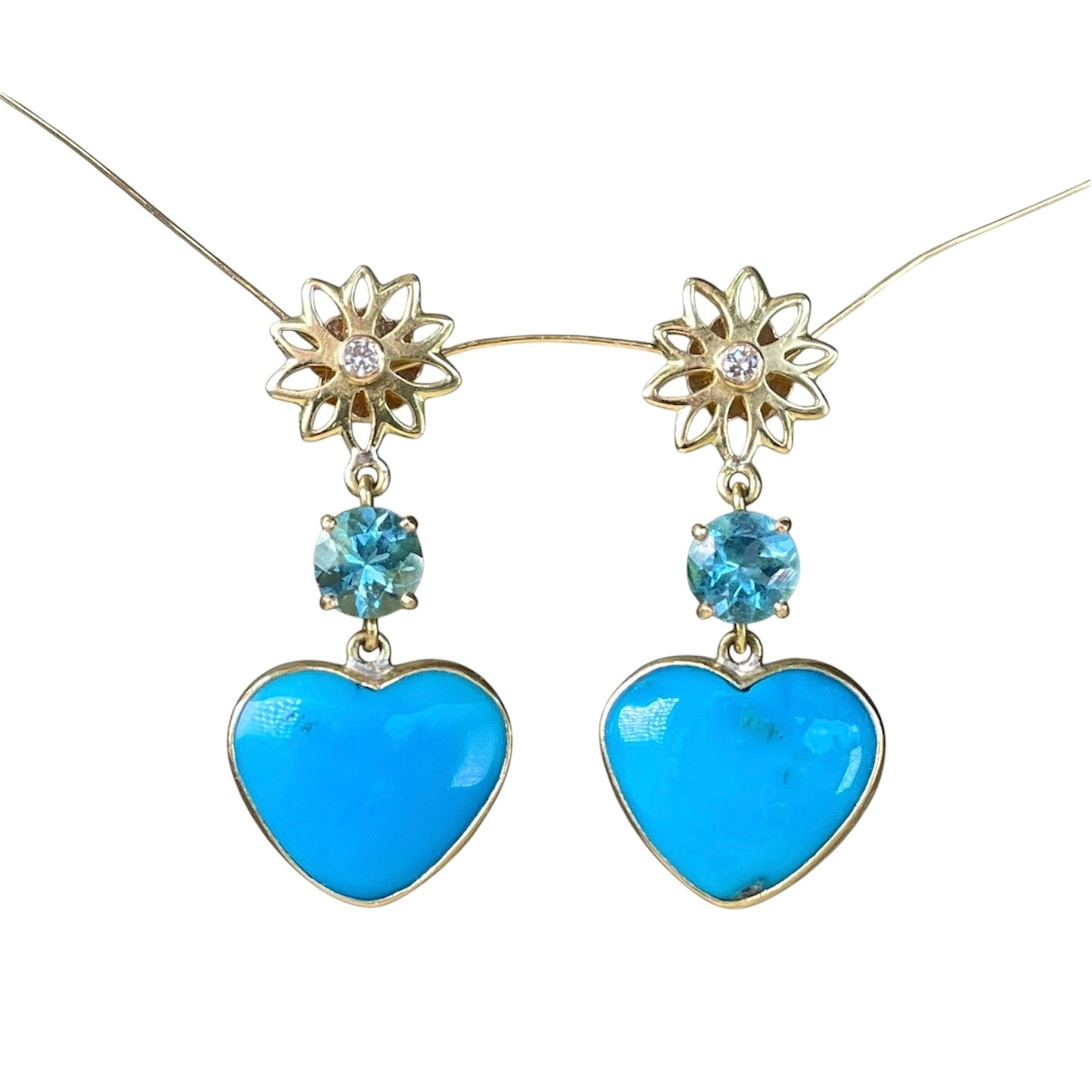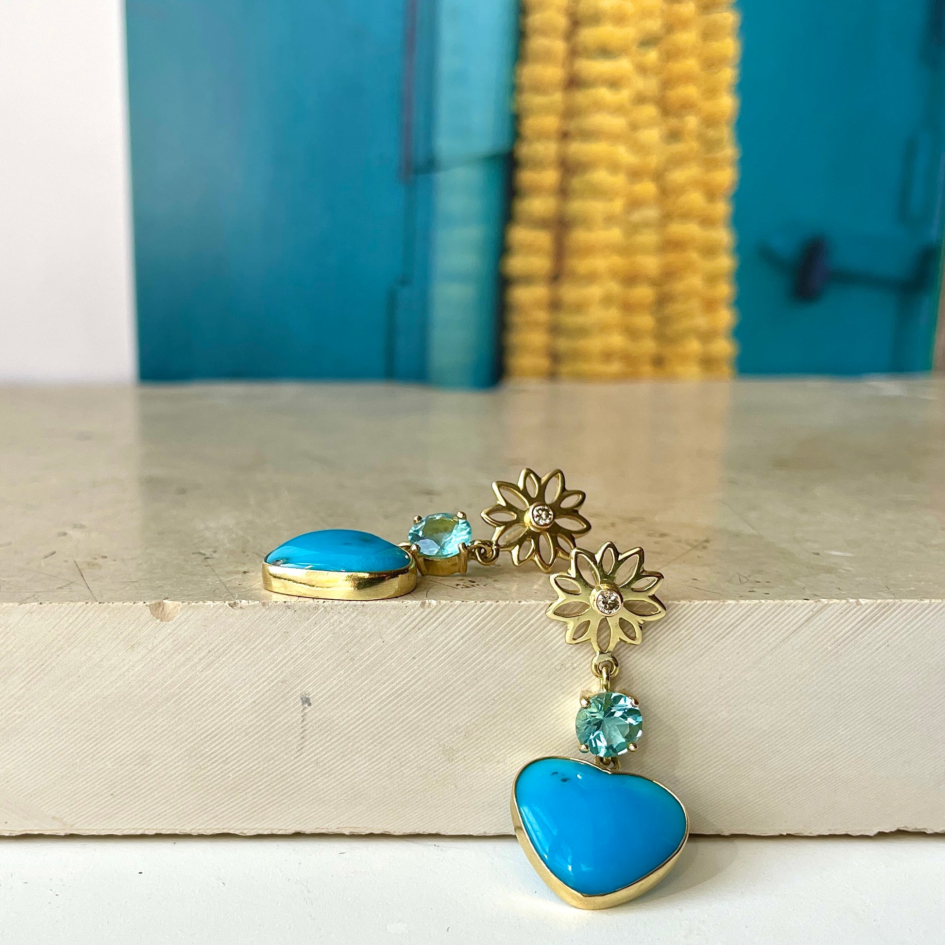Sleeping Beauty Türkis aus dem Amazonas-Gebiet, USA, in Herzform geschliffen. Ein facetierter Aquamarin verbindet das Herz mit einer Goldblume, die einen Diamanten in der Mitte trägt. Handgefertigter Ohrring aus 18-karätigem Gold und Silber, ein einzigartiges Schmuckstück.