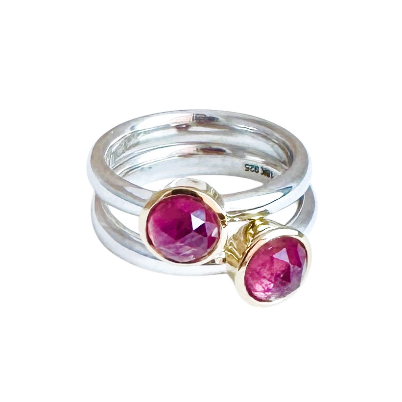 Dieser Rubin Bicolor Ring vereint meisterhafte Handwerkskunst mit edlen Materialien. Von Hand gefertigt, kombiniert hochwertiges Sterlingsilber mit 18 Karat Gold. Der natürliche, unbehandelte pinke Rubin verleiht dem Ring eine einzigartige Ausstrahlung und betont seine exklusive Qualität. Ein Schmuckstück für Kenner, das zeitlose Eleganz und natürliche Schönheit harmonisch verbindet.
