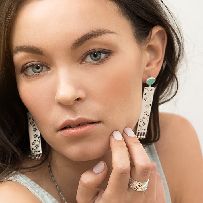 Die Sakura Serie, inspiriert von der japanischen Kirschblüte, präsentiert diesen exquisiten Ohrring. Das breite Silberband mit fein ausgesägten Blütenmotiven erinnert an eine Stoffbahn und verkörpert ein zeitloses Design. Ein essentielles Schmuckstück für Kenner, die die Verbindung zwischen floraler Ästhetik und Naturverbundenheit zu schätzen wissen.