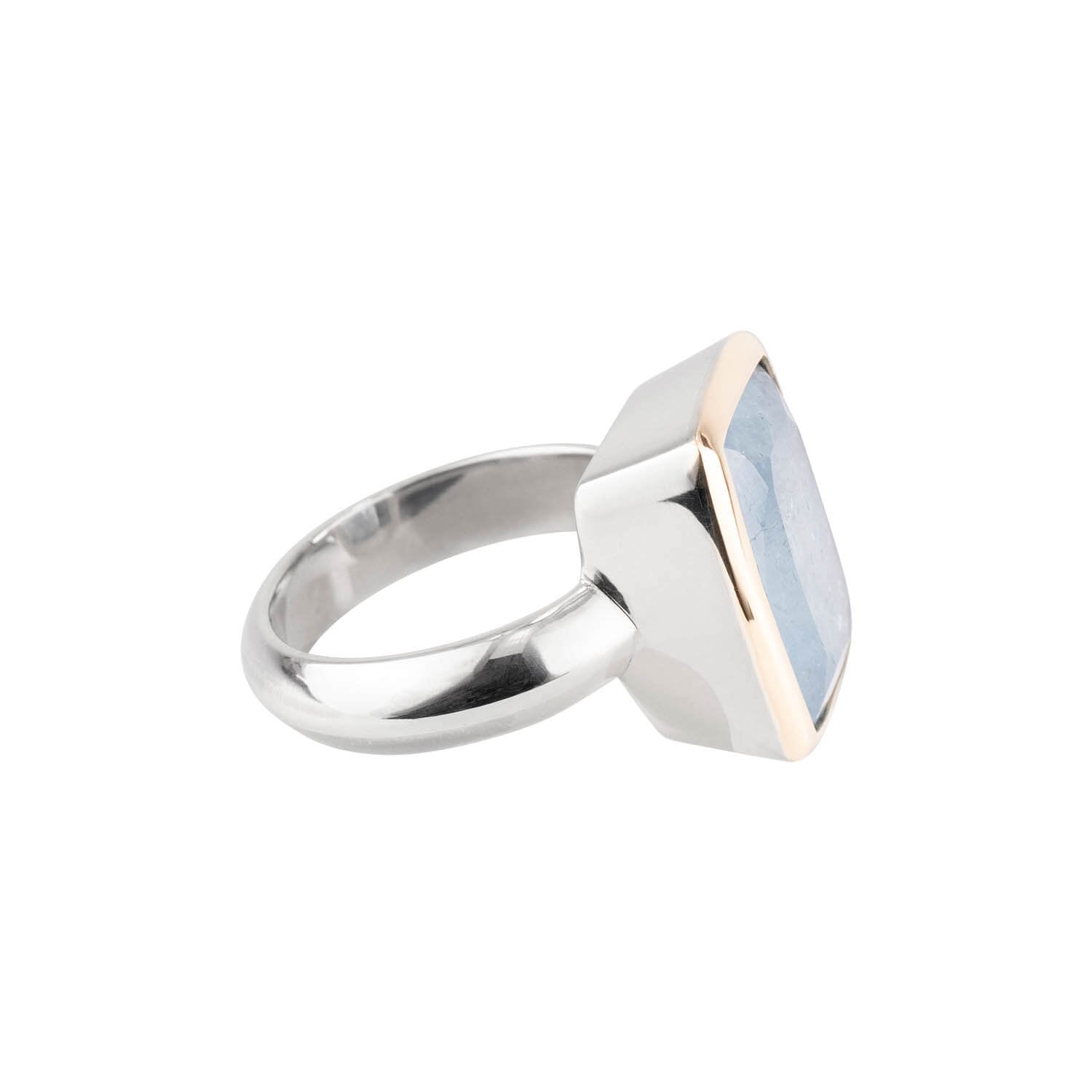 Der Unico Bicolor Ring kombiniert elegantes Sterlingsilber mit einer Fassung aus 18-karätigem Gold. Der silberne Ringaufbau sorgt für einen kostengünstigen Preis, während der Goldstreifen an der Steinfassung dem Ring ein luxuriöses Aussehen und einen markanten Charakter verleiht. Der Aquamarin wird sorgfältig bei vertrauensvollen Edelsteinhändlern ausgewählt, ist naturbelassen und von höchster Qualität. Jedes Stück ist ein handgefertigtes Unikat, das erschwinglichen Stil mit edler Optik vereint.
