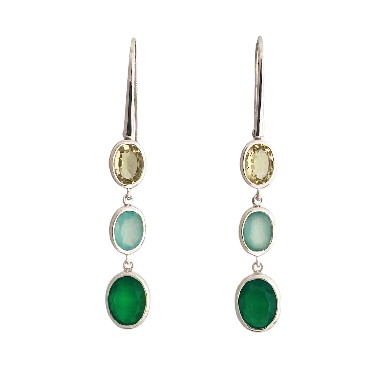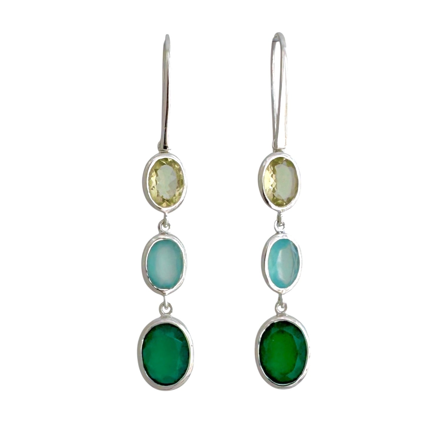 Dieser elegante lange Ohrhänger vereint drei facettierte Steine, Lemon Quarz, Aqua Chalcedon und den grüner Quarz, zu einer harmonischen Komposition. Jeder Stein trägt seine eigene Schwingung, die zusammen eine einzigartige Klangsymbiose erzeugt. Die 3 Klang Ohrringe verbinden ästhetische Raffinesse mit einer subtilen energetischen Wirkung und setzen so ein stilvolles Statement für anspruchsvolle Trägerinnen.