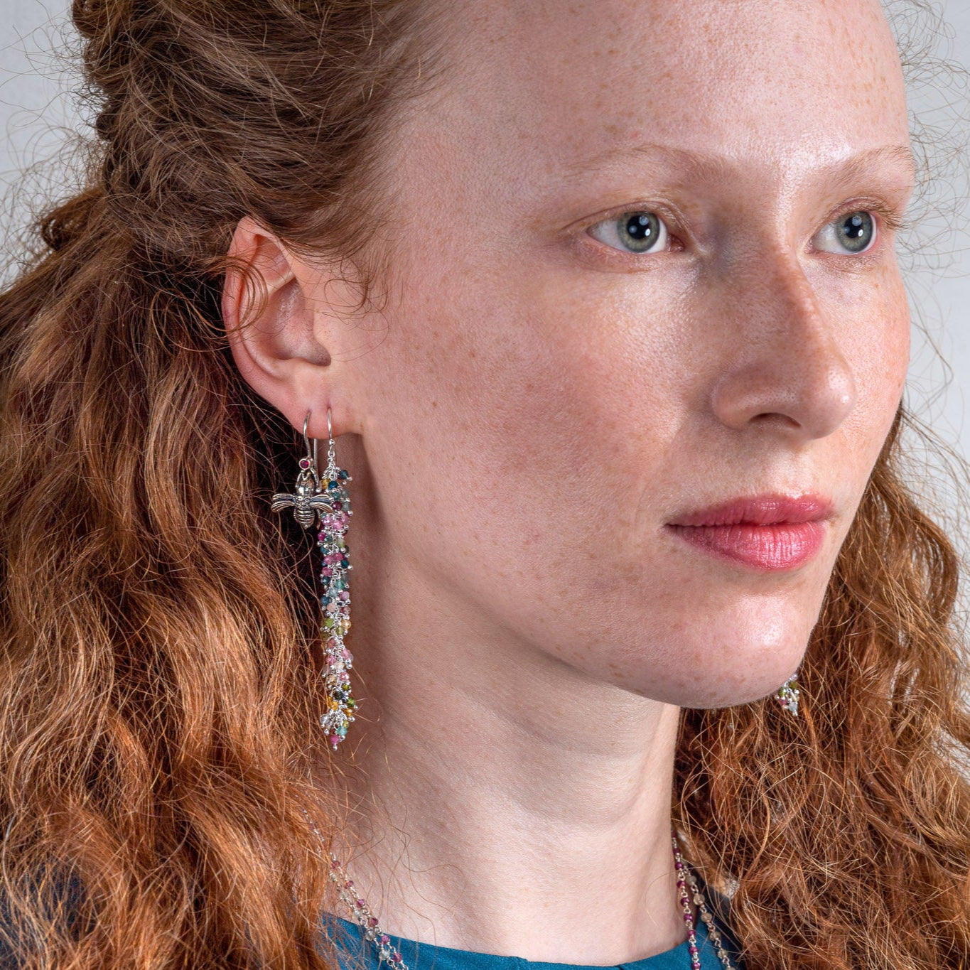 Die Aati Ohrringe in Sterlingsilber/vergoldet bestehen aus zahlreichen Turmalin-Perlen, die sorgfältig per Hand mit Silberdraht montiert wurden. Die natürliche Farbenvielfalt des Turmalins – von zartem Rosa bis tiefem Grün – schafft ein lebendiges Farbenspiel, das jedes Outfit perfekt ergänzt. Diese handgefertigten Ohrringe sind ein fröhlicher Begleiter für jeden Tag.