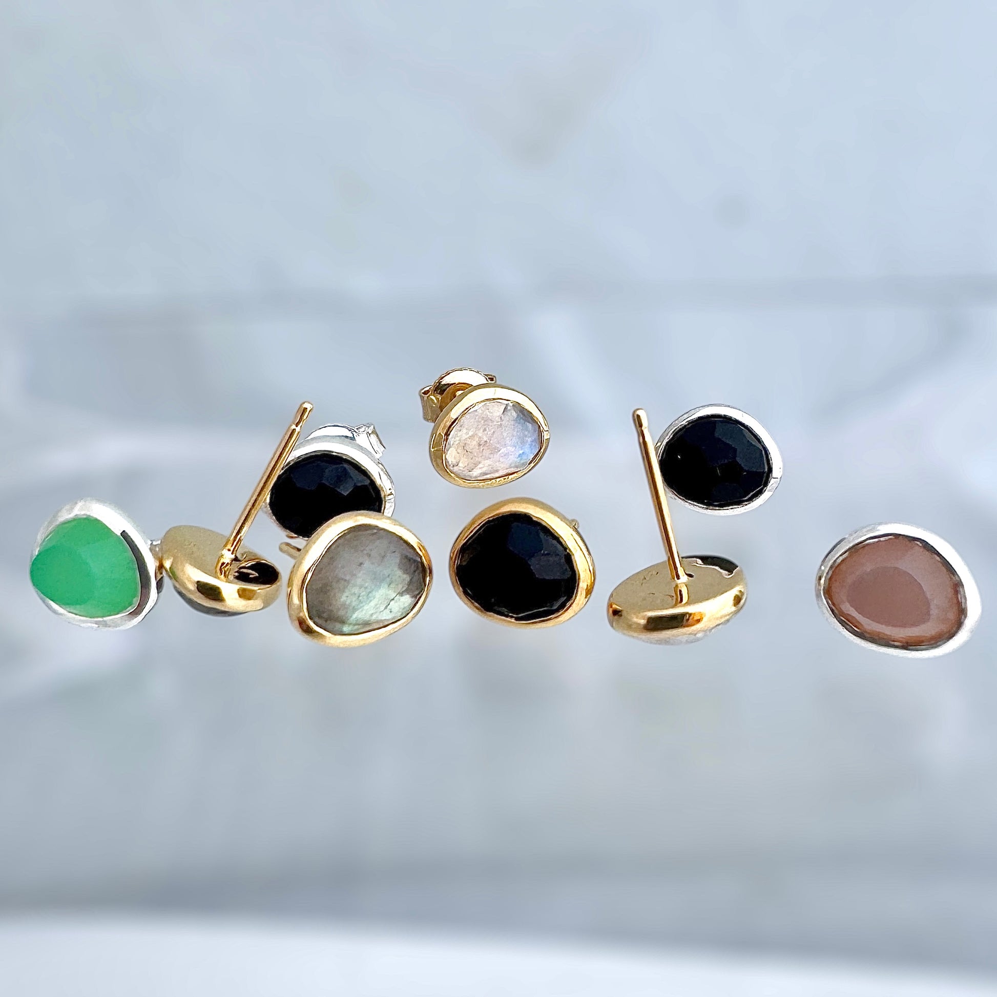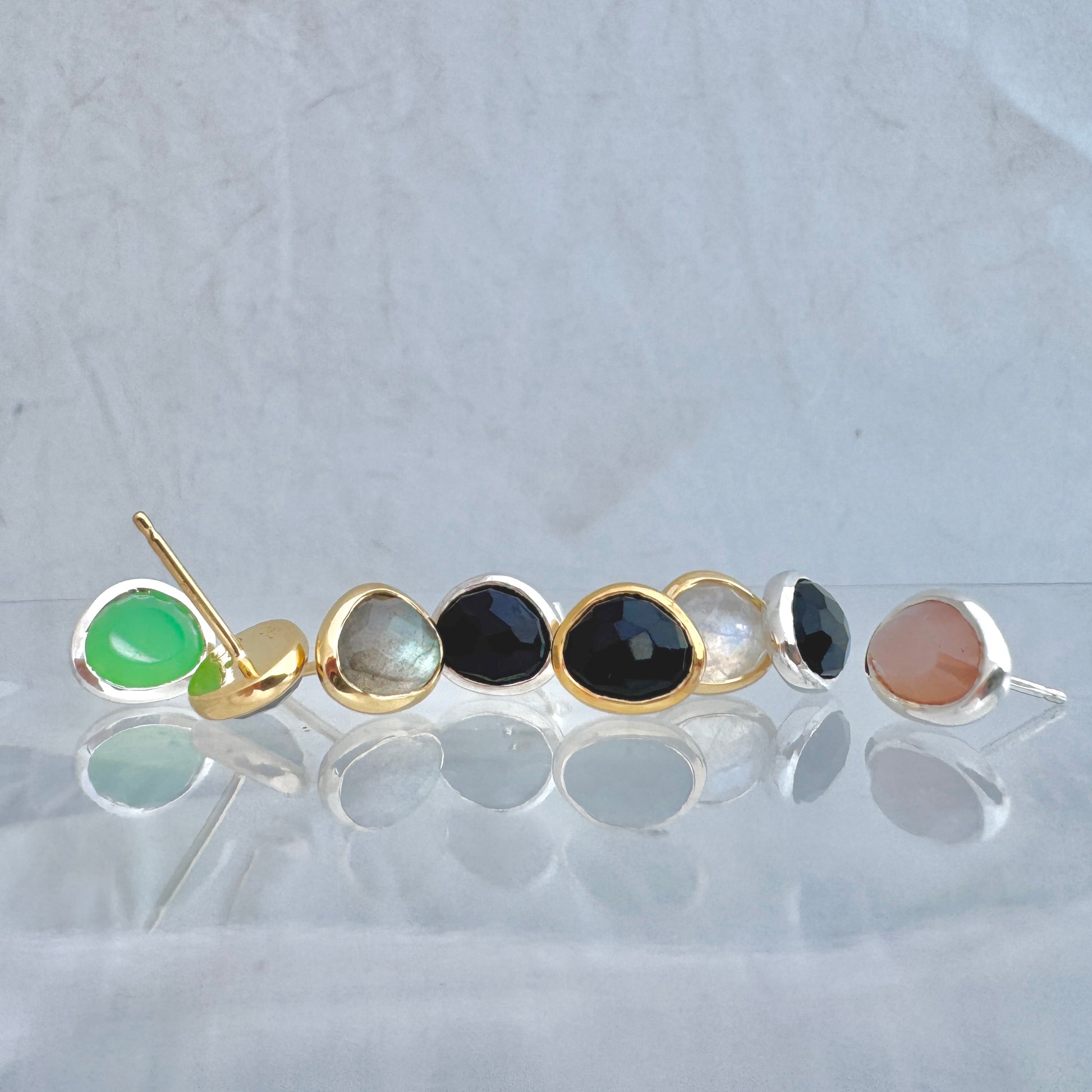 Der Air Stud besticht durch seine elegante Asymmetrie und einen natürlichen Edelstein im unregelmäßigen Rosenschliff, erhältlich in Onyx, Mondstein, Labradorit Pfirsich Mondstein oder Chrysopras. Mit diesem minimalistischen Design lässt sich dieser Ohr Stecker wunderbar tragen, ein extravagantes Schmuckstück für jeden Tag.