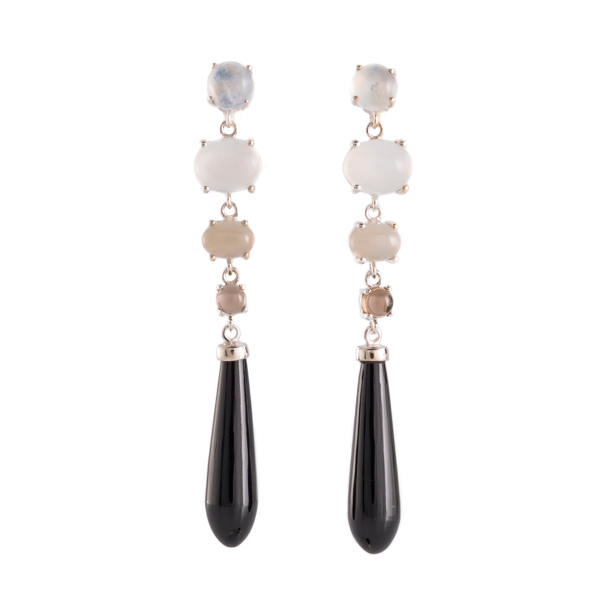 Unsere Amples Ohrringe aus geschwärztem Sterlingsilber sind mit einem Onyx, Rauchquarz und Mondstein versehen, die perfekte Ergänzung zu Ihrer Kollektion.