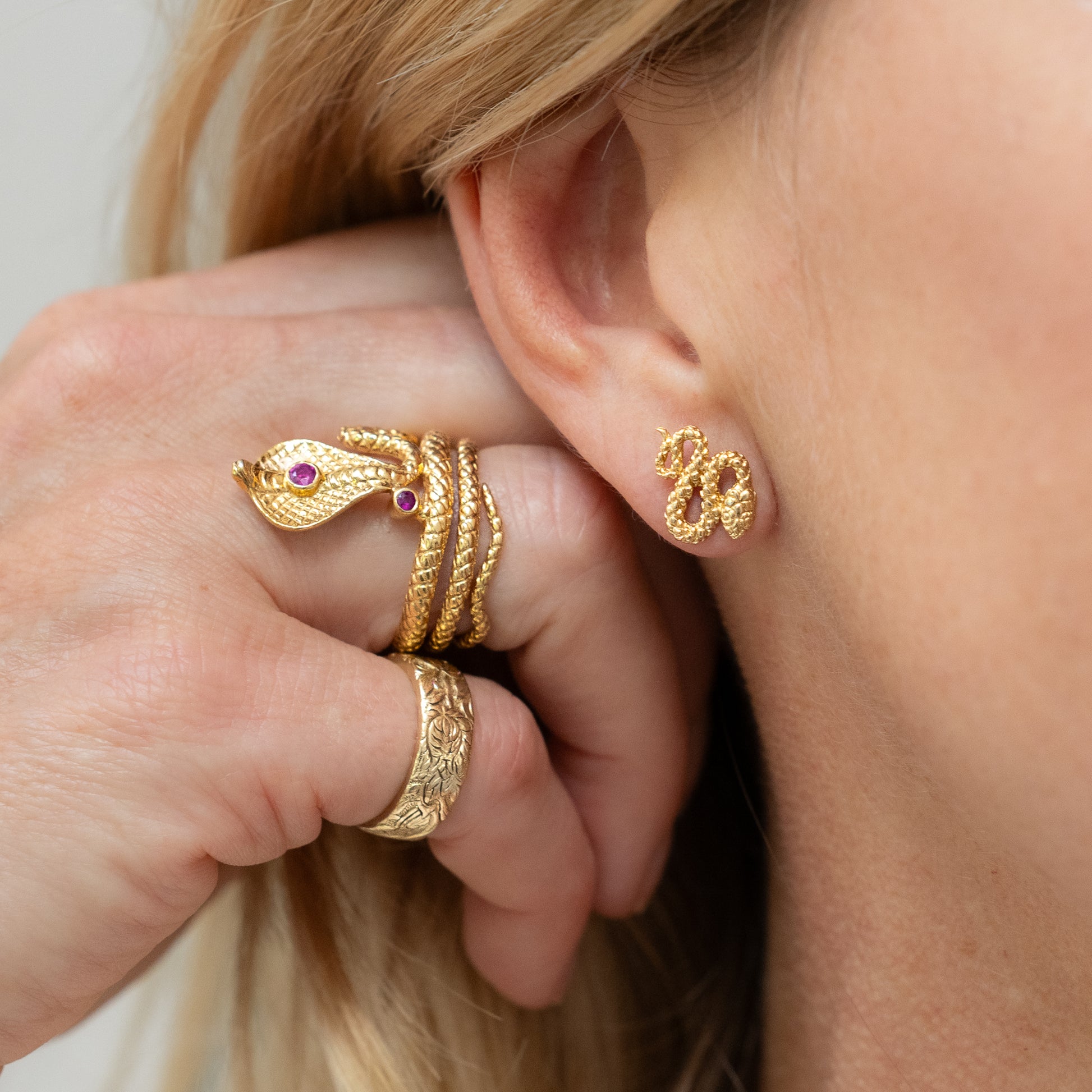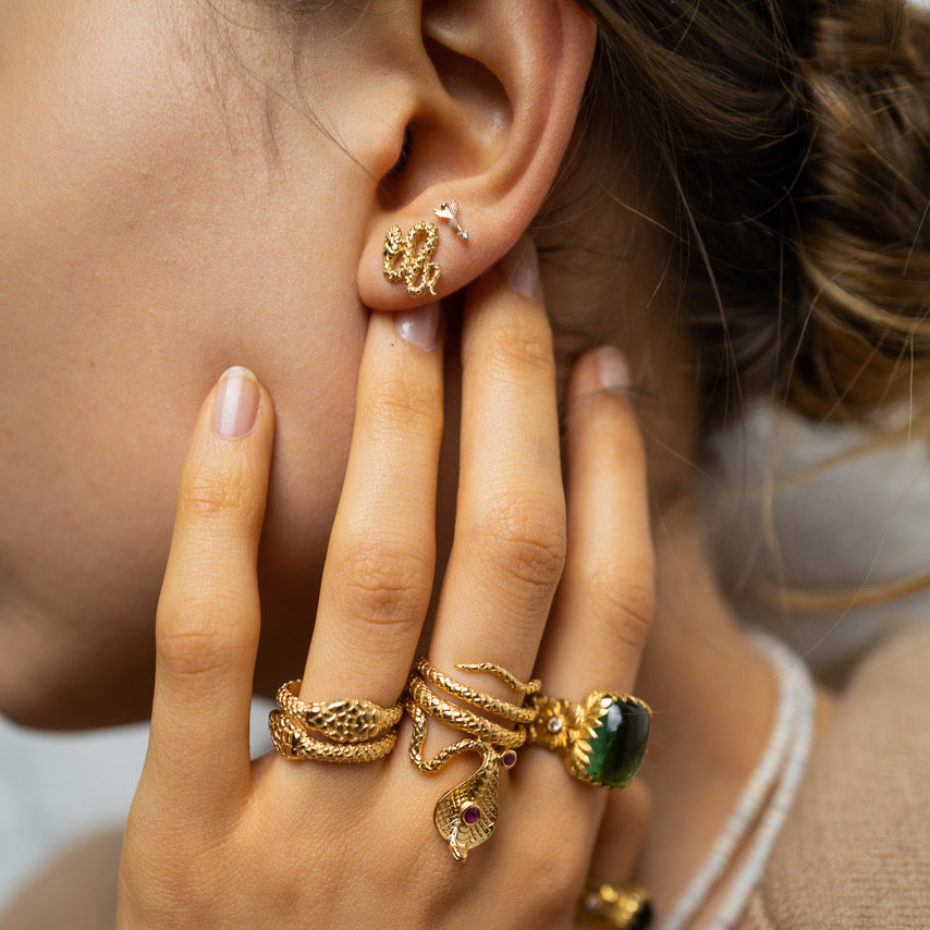 Die Cobra Studs gehören zur Schlangen Kollektion von SABHA. Die Schlange stellt in allen Kulturen die grundlegende Lebens- und Schöpferkraft dar. Sie symbolisiert die heilende Kraft der Natur. Die Kundalini-Schlange, der Hermesstab, der Ouroboros und viele weitere sind in unterschiedlichsten Kulturen prägende Symbole.