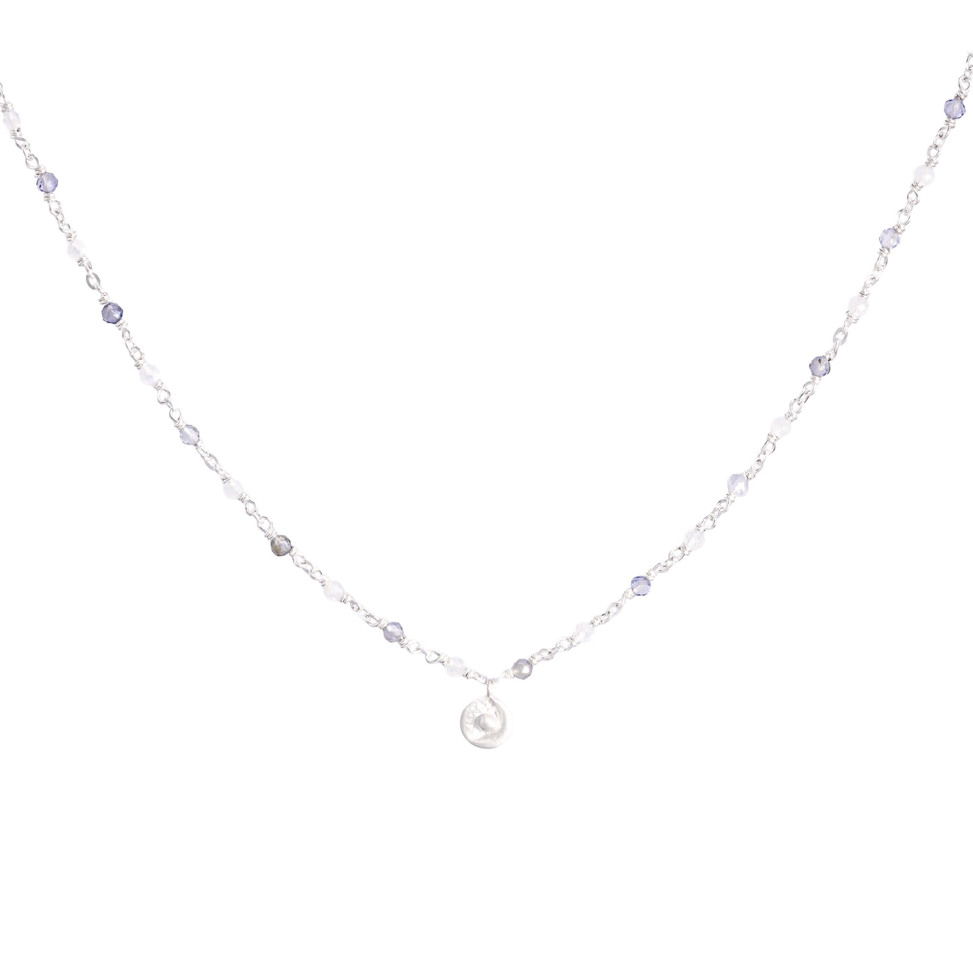 Unsere Moon Kette ist handgefertigt aus feinem Silberdraht und echten Iolith und Mondsteinen.